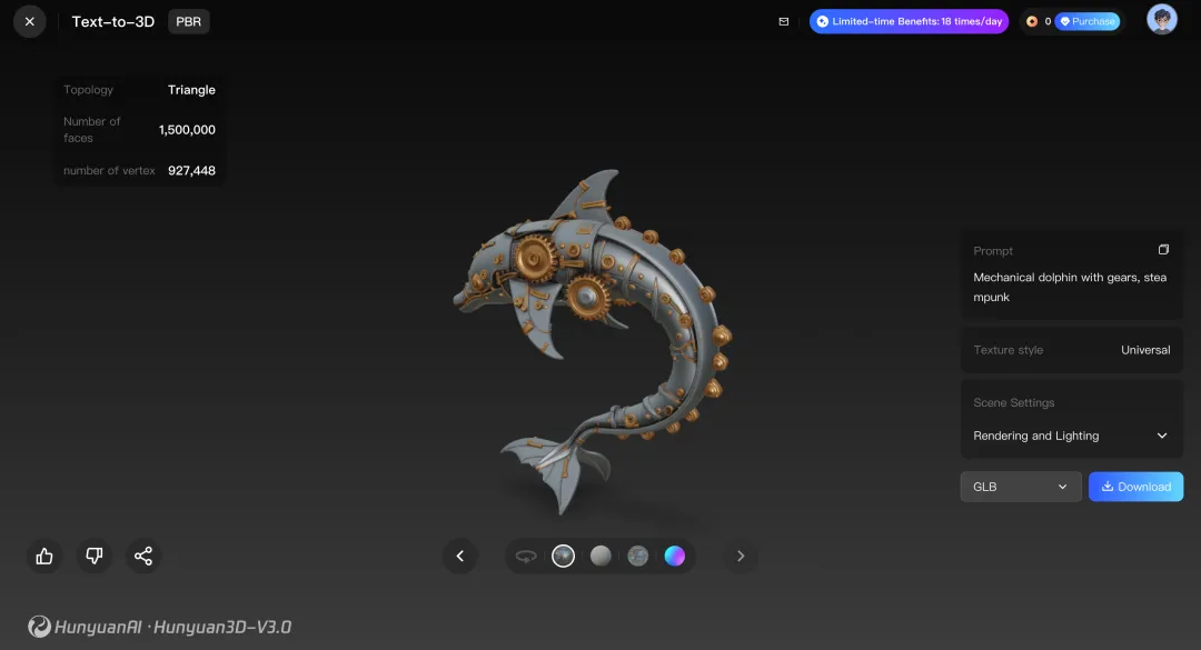 1、文生3D:只需输入文本描述,比如,“Mechanical dolphin with gears, steampunk(带有齿轮的机械海豚,蒸汽朋克风)”,便可一键生成符合创作意图的3D模型,模型能准确理解用户描述的风格、形态、材质等细节,实现更好的遵循度及一致性效果。