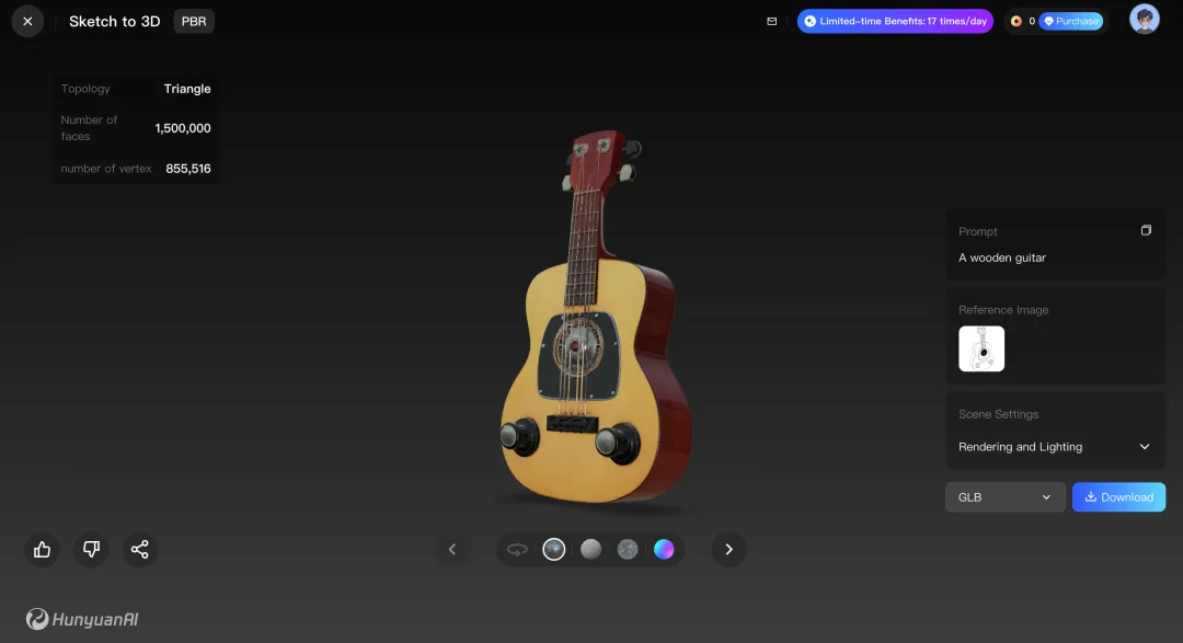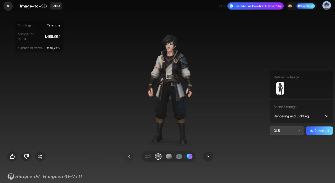 同时,混元3D平台提供了专业级的模型编辑与调整能力,支持OBJ、GLB等主流3D格式输出,可无缝集成到Unity、Unreal Engine、Blender等专业软件中,适配多种专业工作流程,让生成的3D资产能马上投入到实际项目使用。
