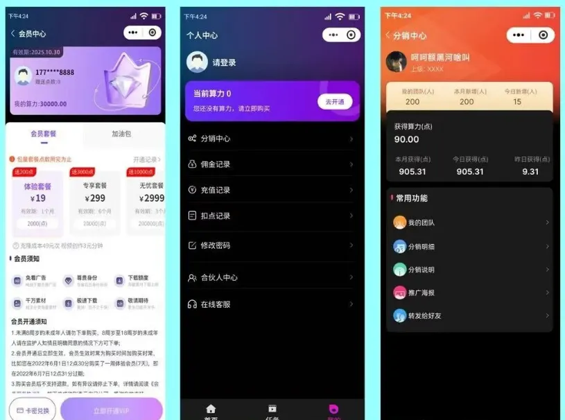 会员中心、分销中心、个人中心功能齐全,提供多种会员套餐与加油包选择,不同套餐对应不同算力点数与有效期,满足多样化使用需求。无论是个人创作使用,还是发展团队分销,都能找到合适的盈利路径。